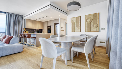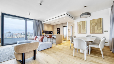 The apartment features a spacious open-plan layout with a combined kitchen, dining, and living area, fully equipped with modern kitchen appliances. Large windows with double glazing fill the space with natural light and offer pleasant city views. High-quality ceramic tiles throughout enhance the contemporary design.
